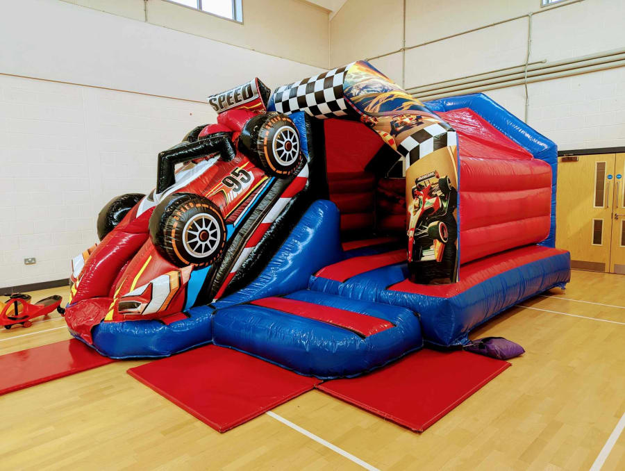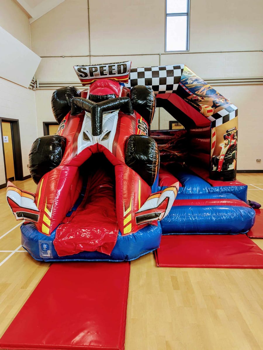 🏁 Ready, set, bounce! 🚗💨 The 3D Racing Car Bouncy Castle with Front Slide is the perfect addition to your upcoming party in Bromham, Cranfield, or Marston Moretaine. This bouncy castle is not your average inflatable - it's a high-octane race track adventure that will have kids revving with excitement!
