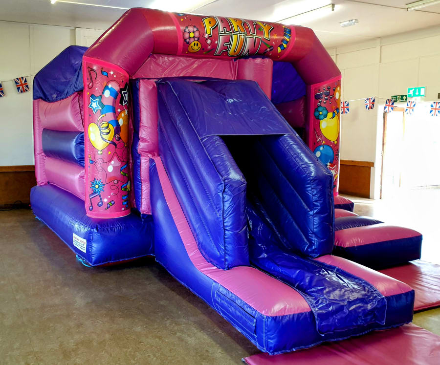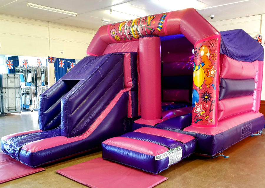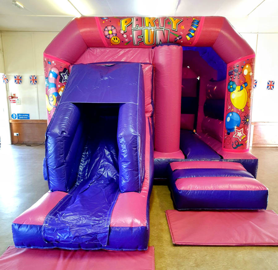 Lovely pink/purple party themed bouncy castle with front slide. Has a generous sized bouncing area and also has the bonus of a slide. This castle can be adapted to suit your theme using velcro panels.