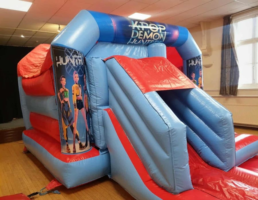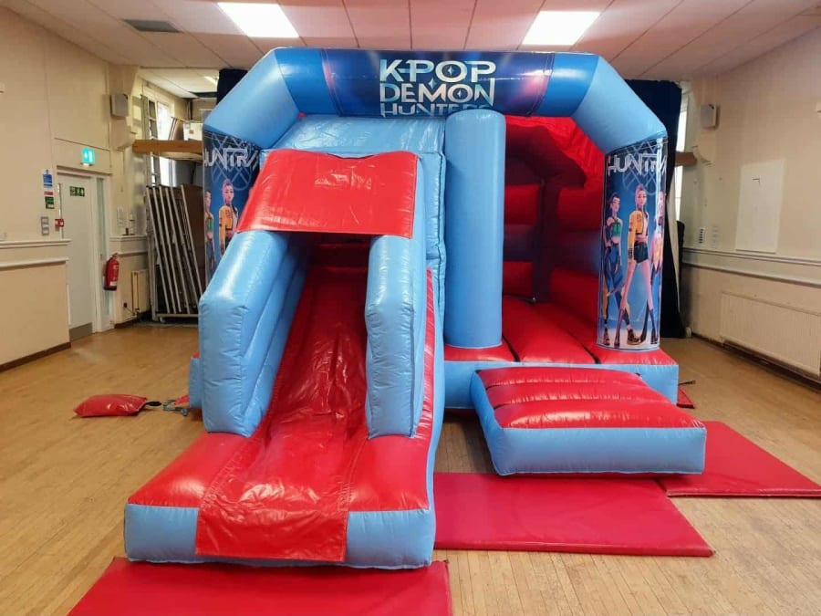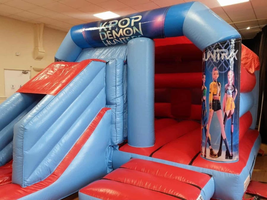 Excite kids with the K-POP Demon Hunters Bouncy Castle with Front Slide. Bright graphics and a fun front slide create nonstop play. Compact enough for gardens. big enough for group fun. Perfect for birthdays, events, and school fêtes across Luton, Milton Keynes, Bedford, Biggleswade, and Sandy.