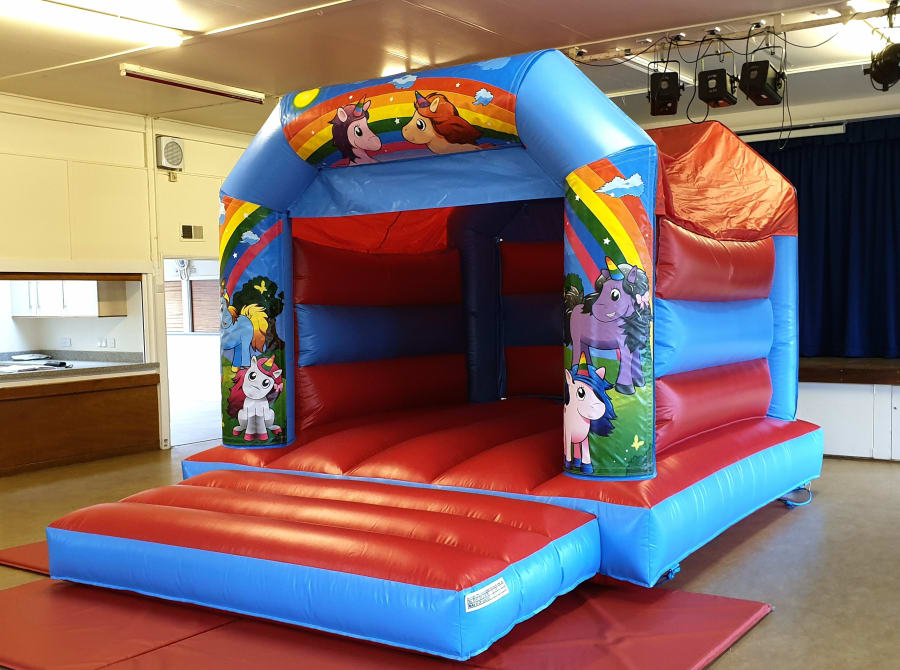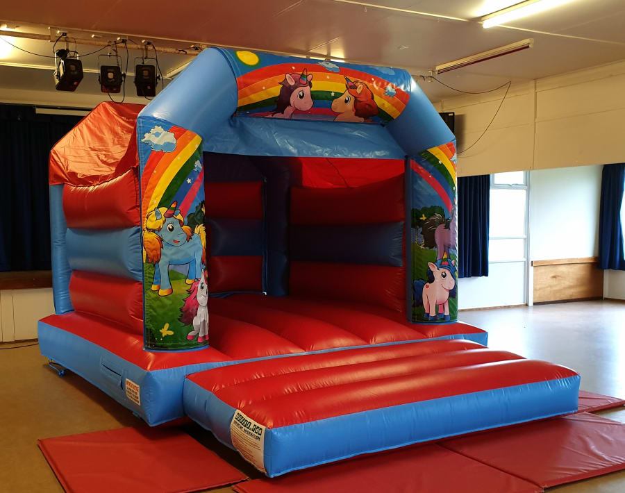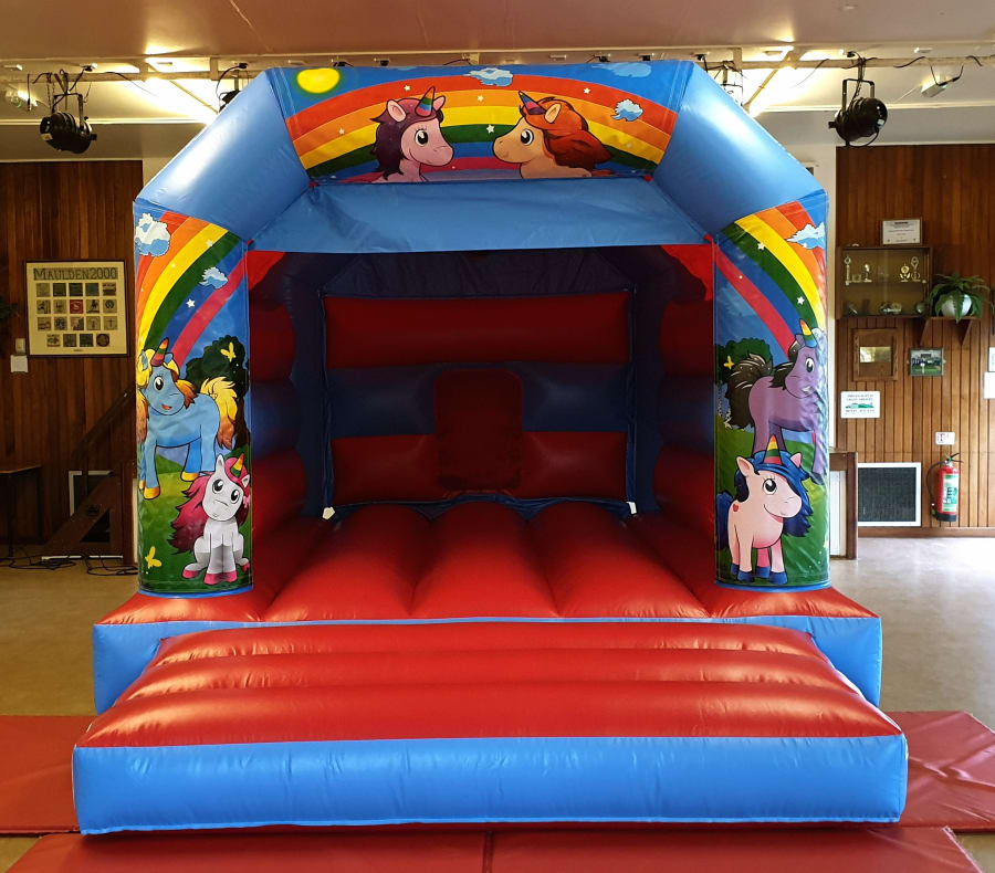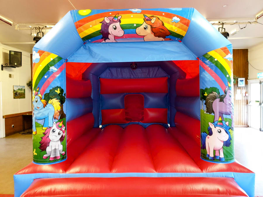 Gorgeous bright, colourful rainbow unicorn bouncy castle.