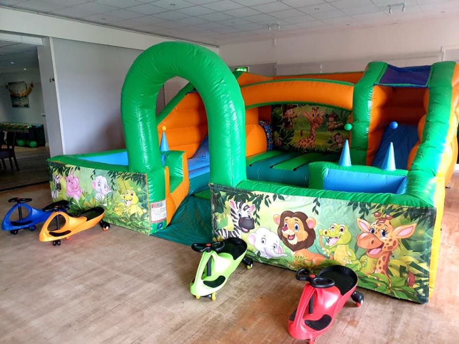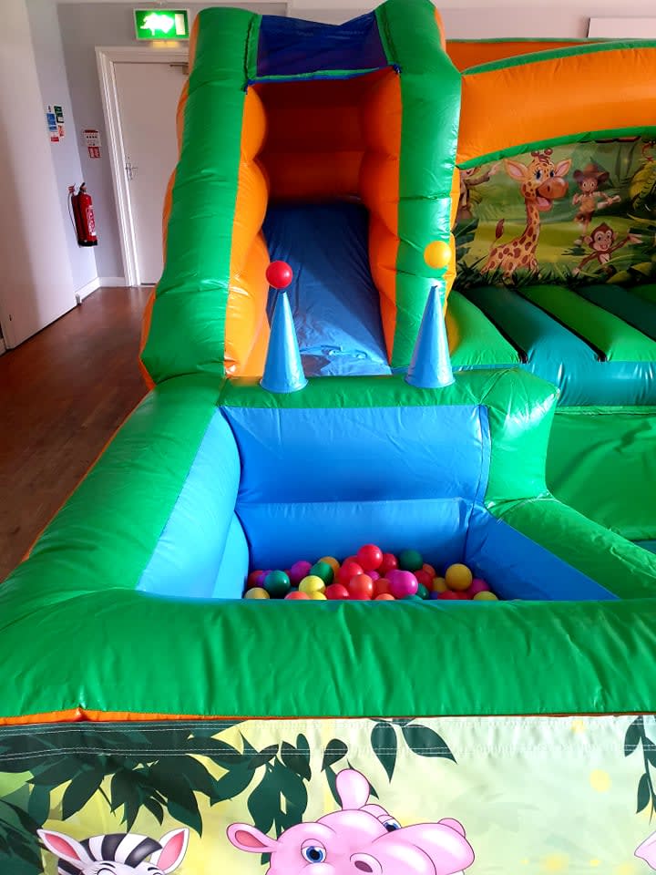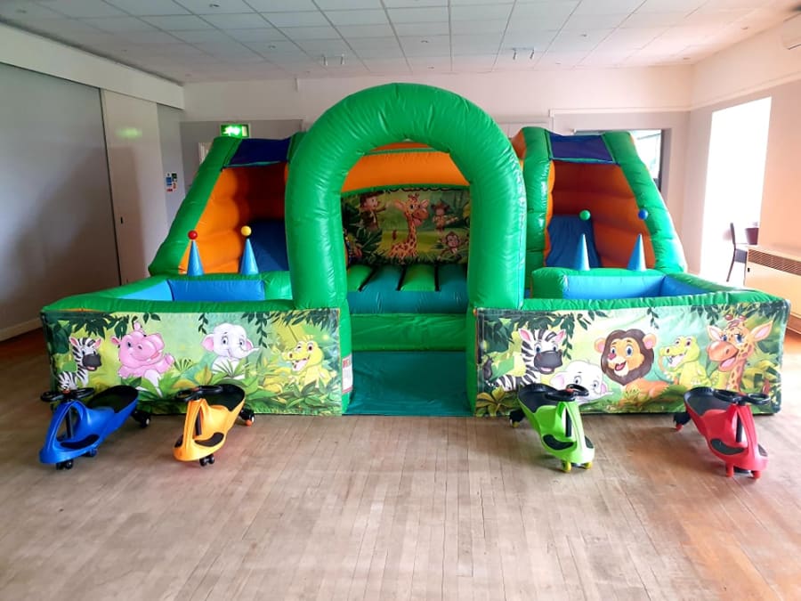 Our twin slide play parks are so popular that we thought we would add a new one to our hire list. This Jungle themed play park has 2 slides, a bouncy castle in the middle and 2 ball ponds with air jugglers at the bottom of the slides. If that wasn't enough fun we also include 4 didi cars for the kids to whizz around the hall on.